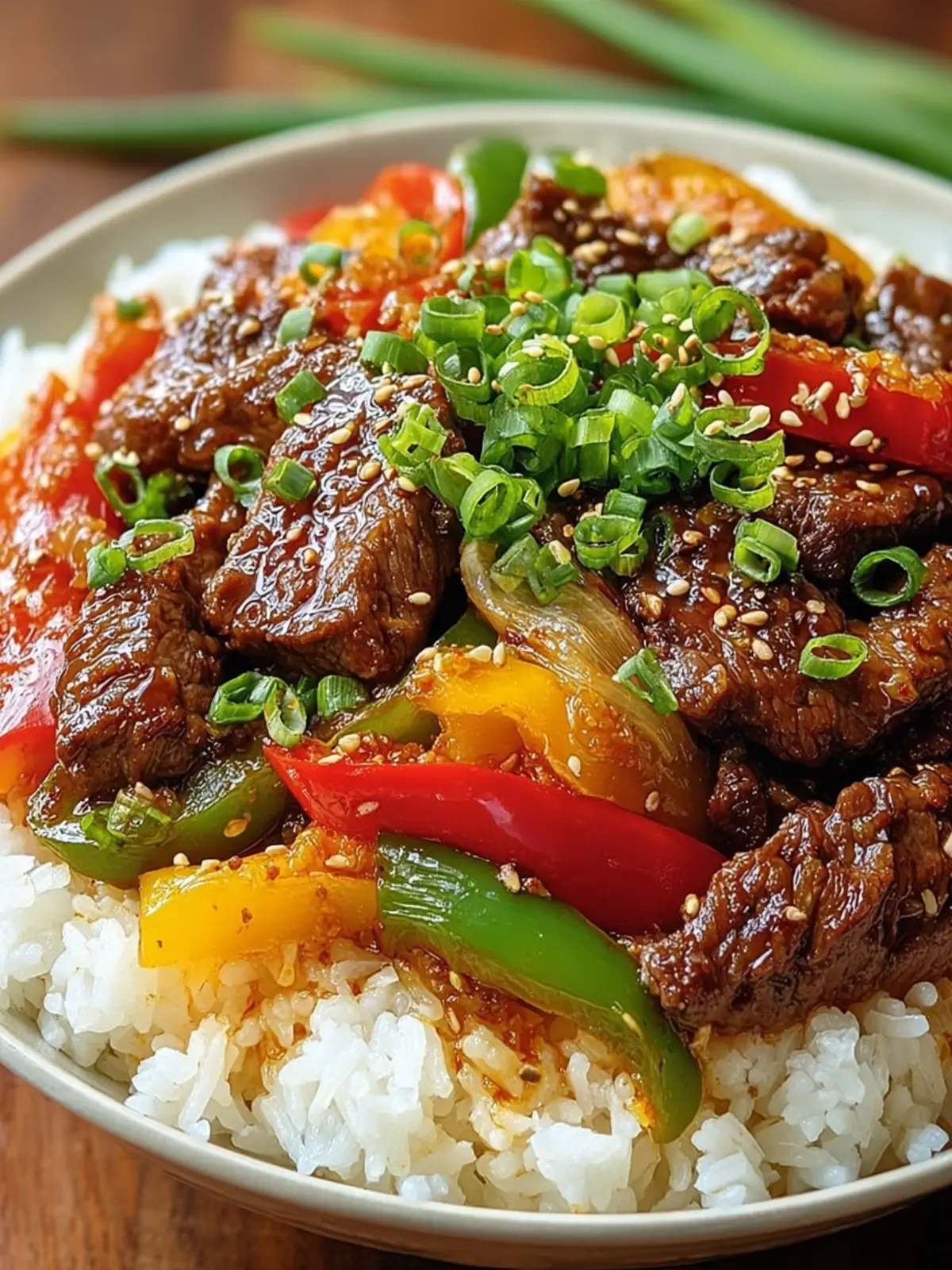 Chopped green onions brighten up your beef and pepper rice bowl, offering a fresh, vibrant finish. Their crispness and mild oniony bite pair beautifully with the richness of the beef and the sweetness of the bell peppers. Plus, these little green gems add visual appeal, making the dish inviting and colorful.