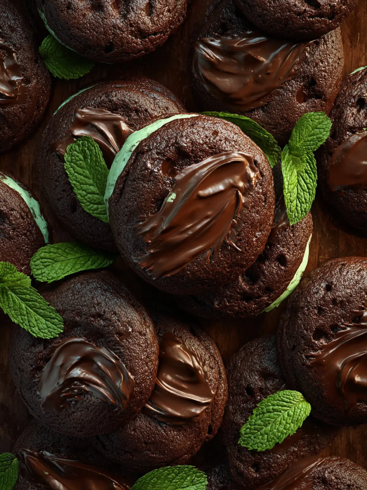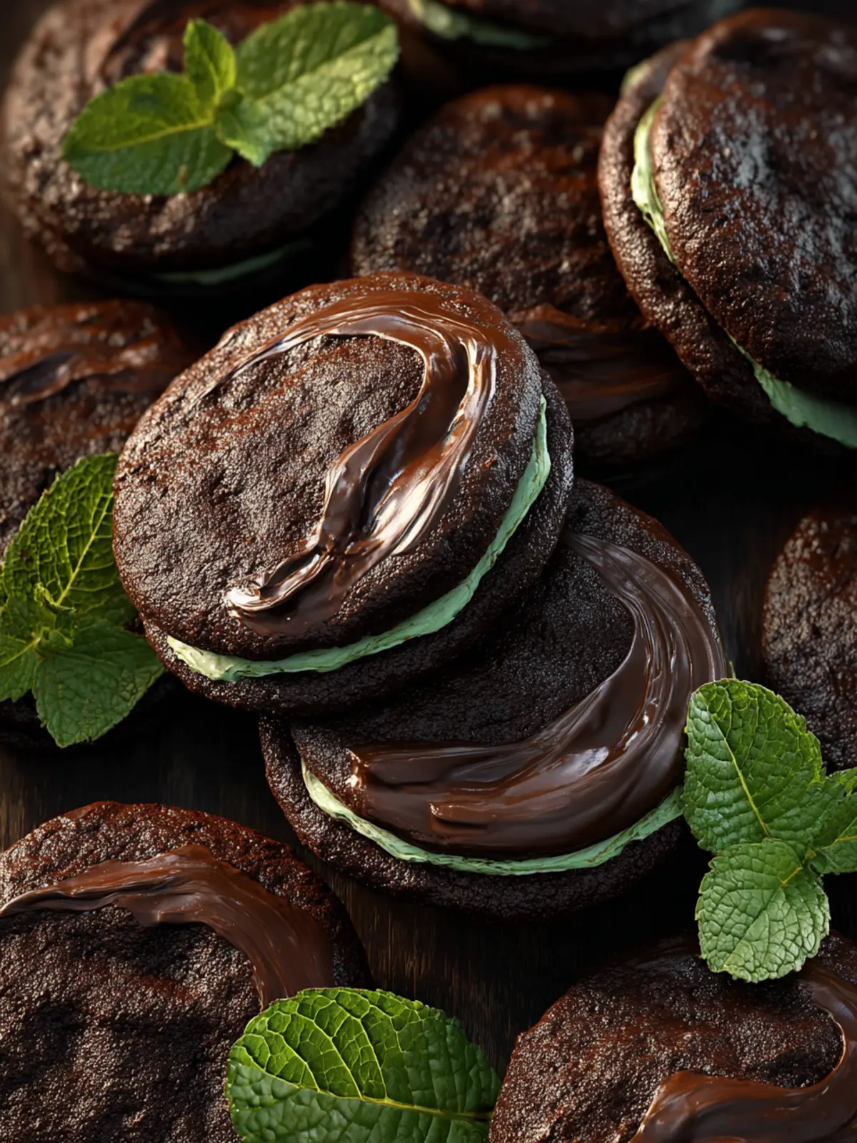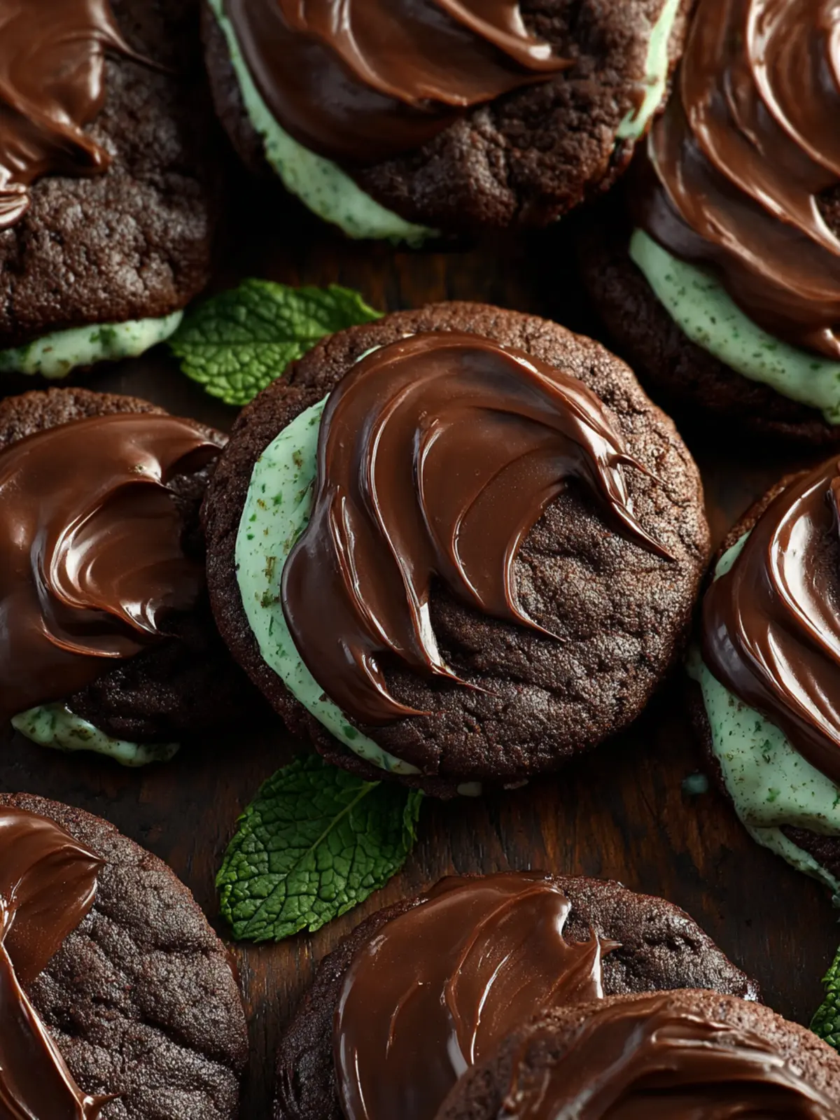 A delectable mint chocolate cookie filled with creamy peppermint filling and topped with silky chocolate ganache.