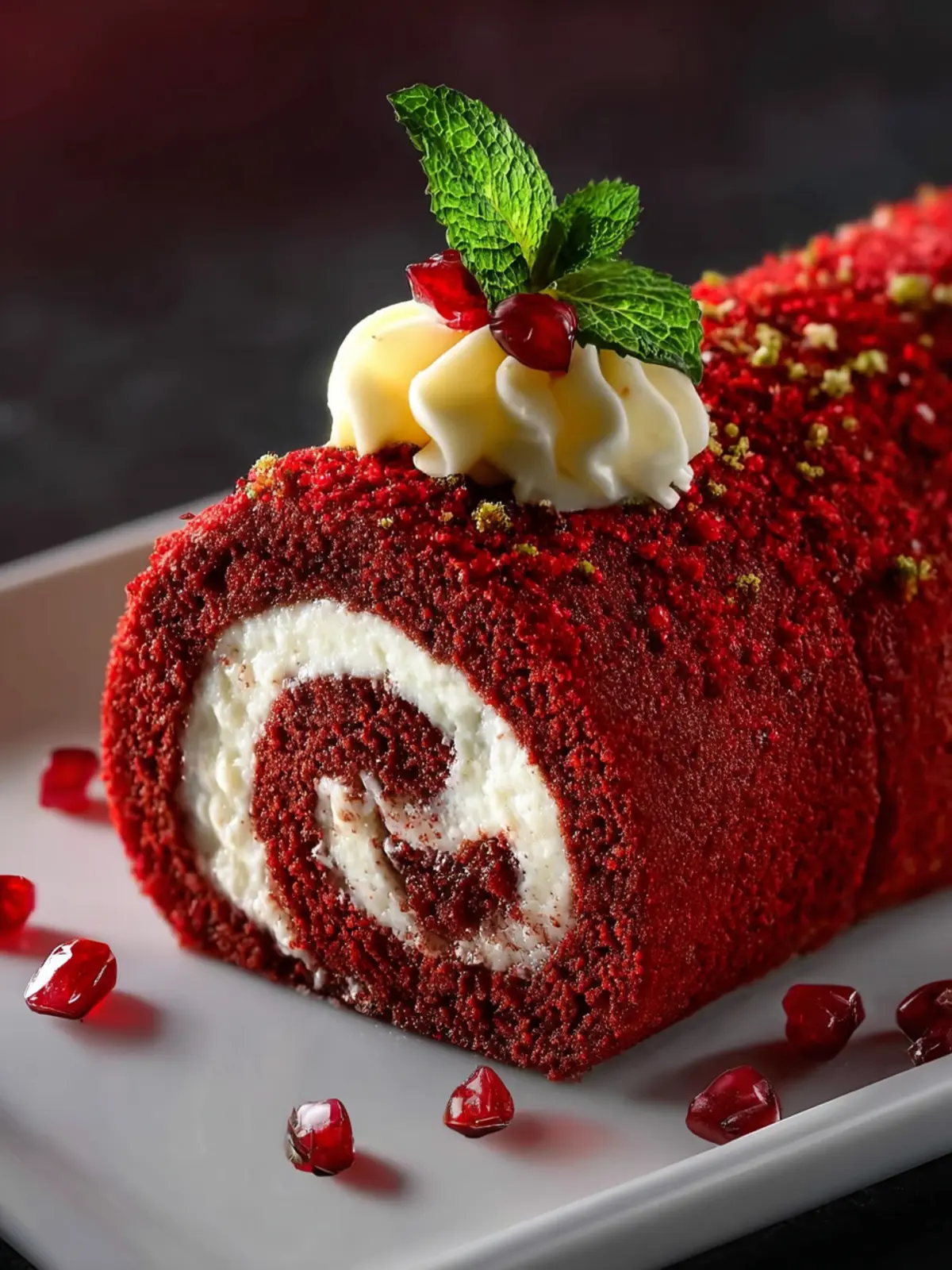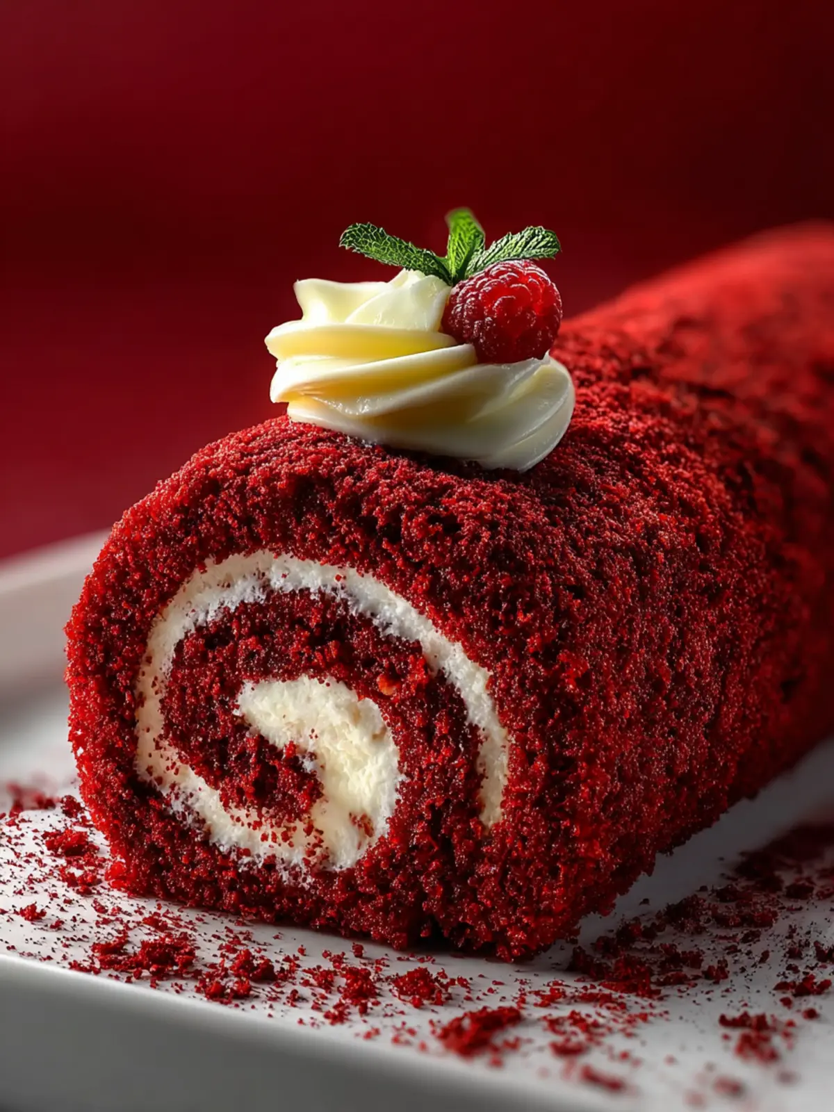 A delightful red velvet cake rolled with a creamy filling, perfect for dessert lovers.