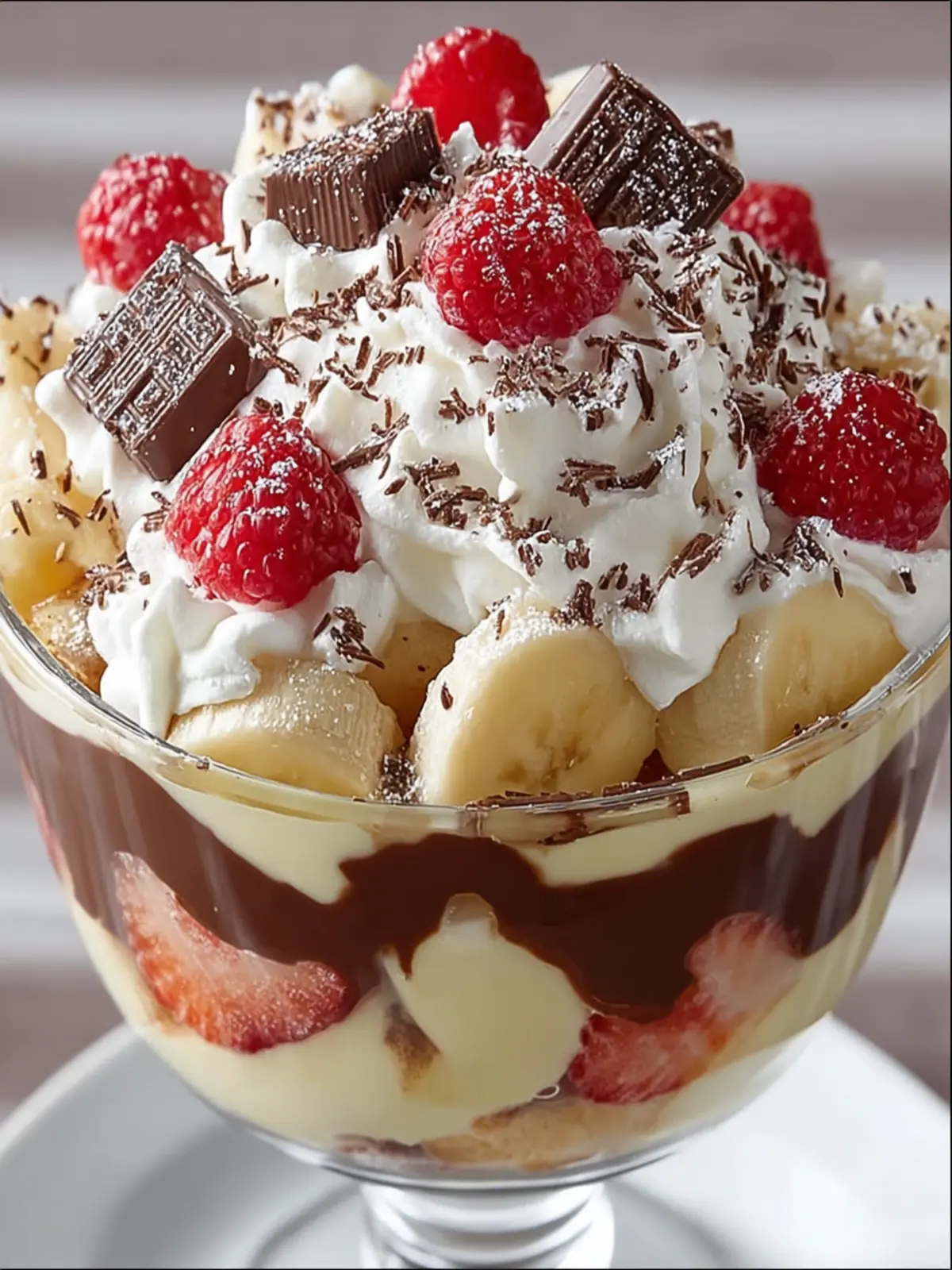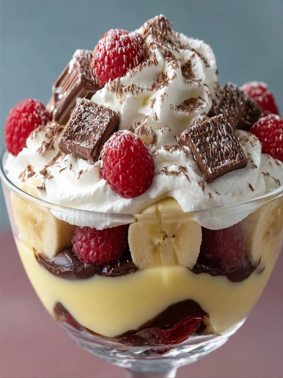 - Fruit layer: Add a layer of sliced bananas and raspberries on top of the pudding.