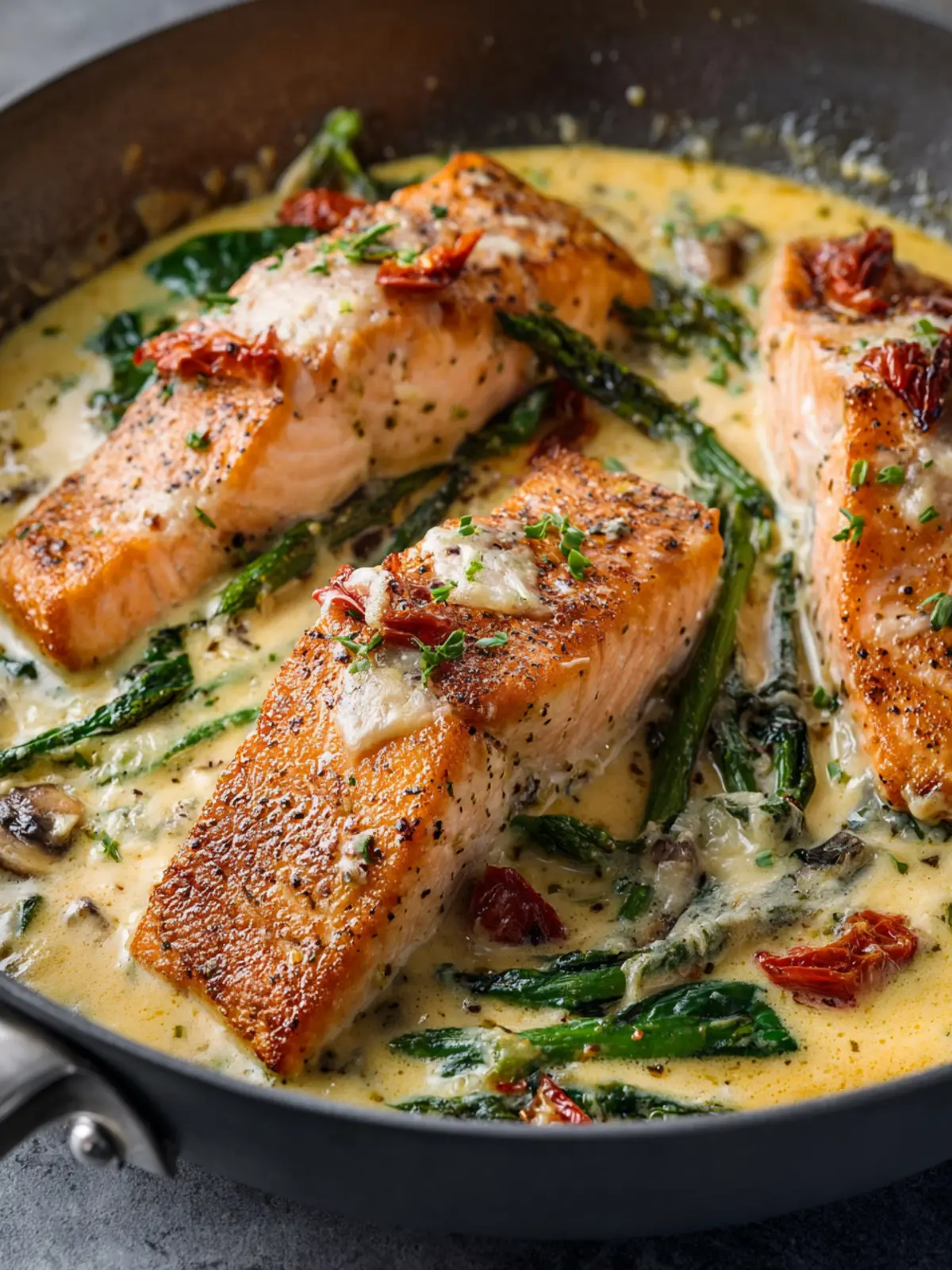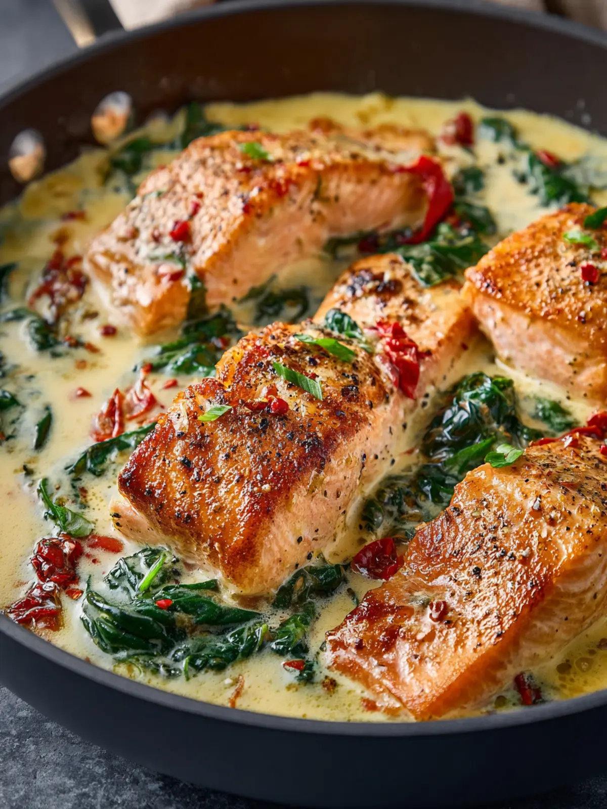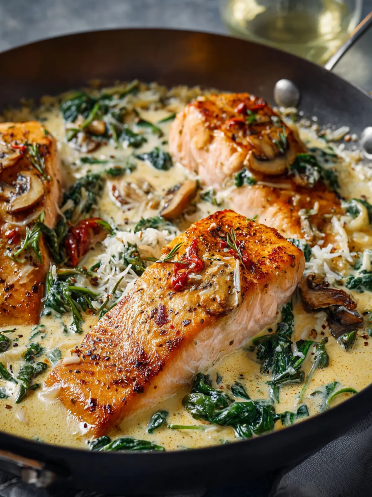 The actual cooking takes about 15 minutes. You’ll be browning the salmon first, then creating that creamy sauce with garlic, spinach, and sun-dried tomatoes. It’s a quick process that results in incredible flavor.
