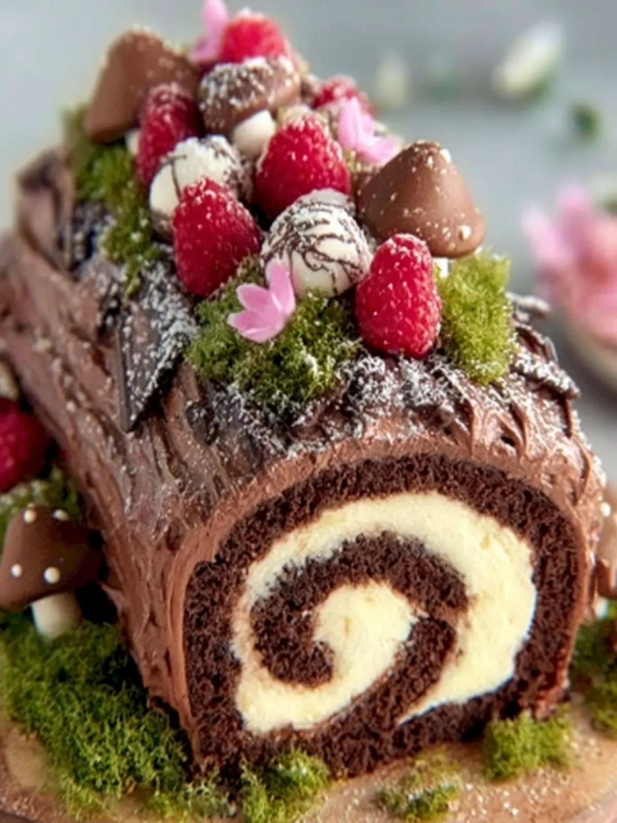 - Decorate: Spread the remaining ganache over the outside of the log, using a spatula to create bark-like texture. Use green food coloring to dye the edible moss (crushed pistachios or shredded coconut). Garnish with raspberries, chocolate mushrooms, and edible flowers. Dust with powdered sugar for a snowy effect.