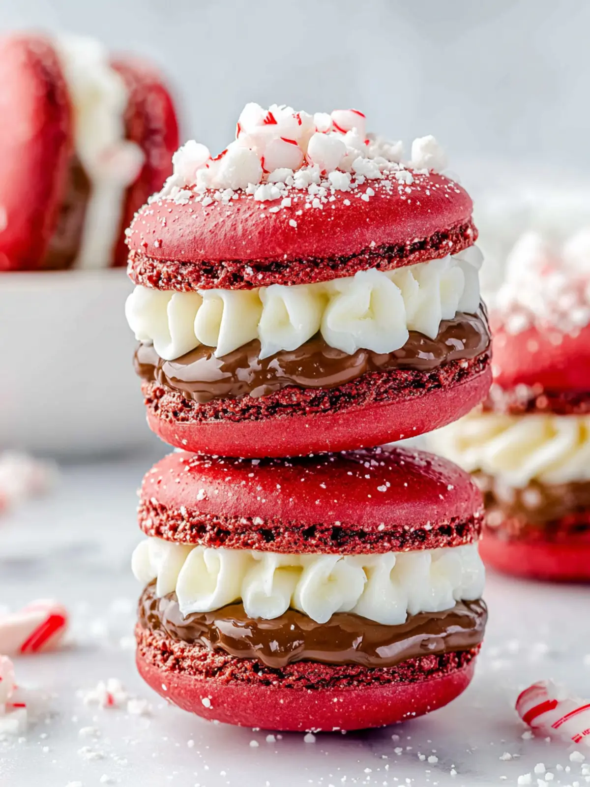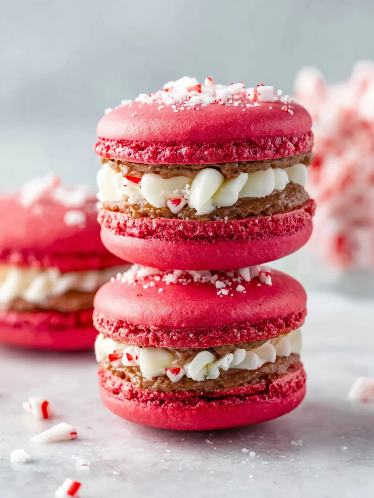 Delicious peppermint macarons filled with rich chocolate buttercream and coated with crushed candy canes.