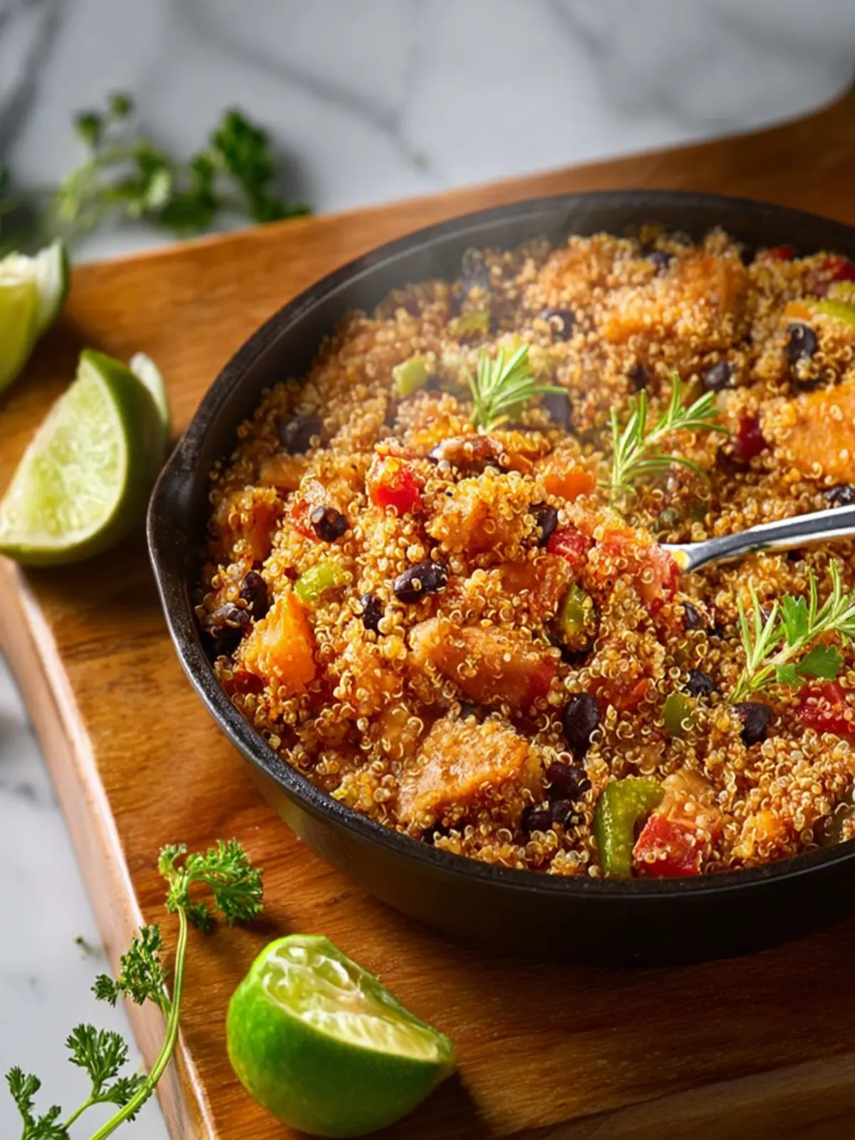 A hearty and nutritious baked quinoa dish packed with black beans, sweet potatoes, and spices.