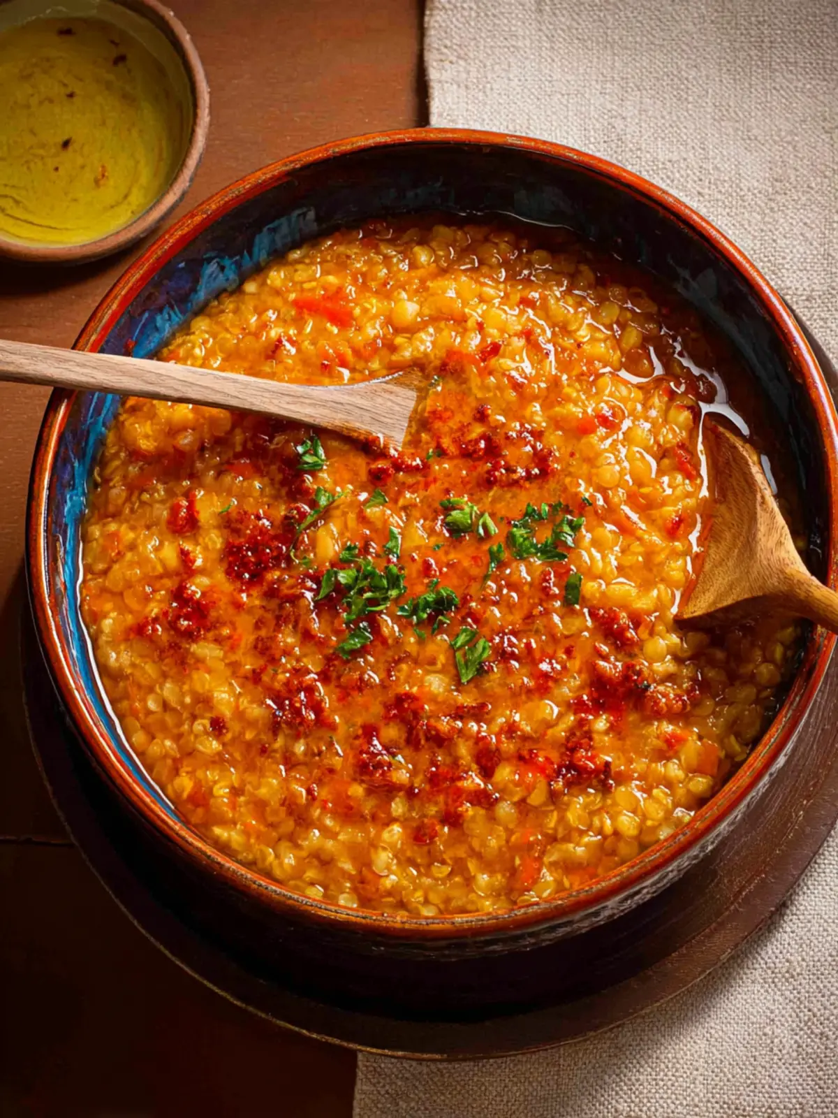A hearty and flavorful Turkish stew made with red lentils, bulgur, and infused oils.