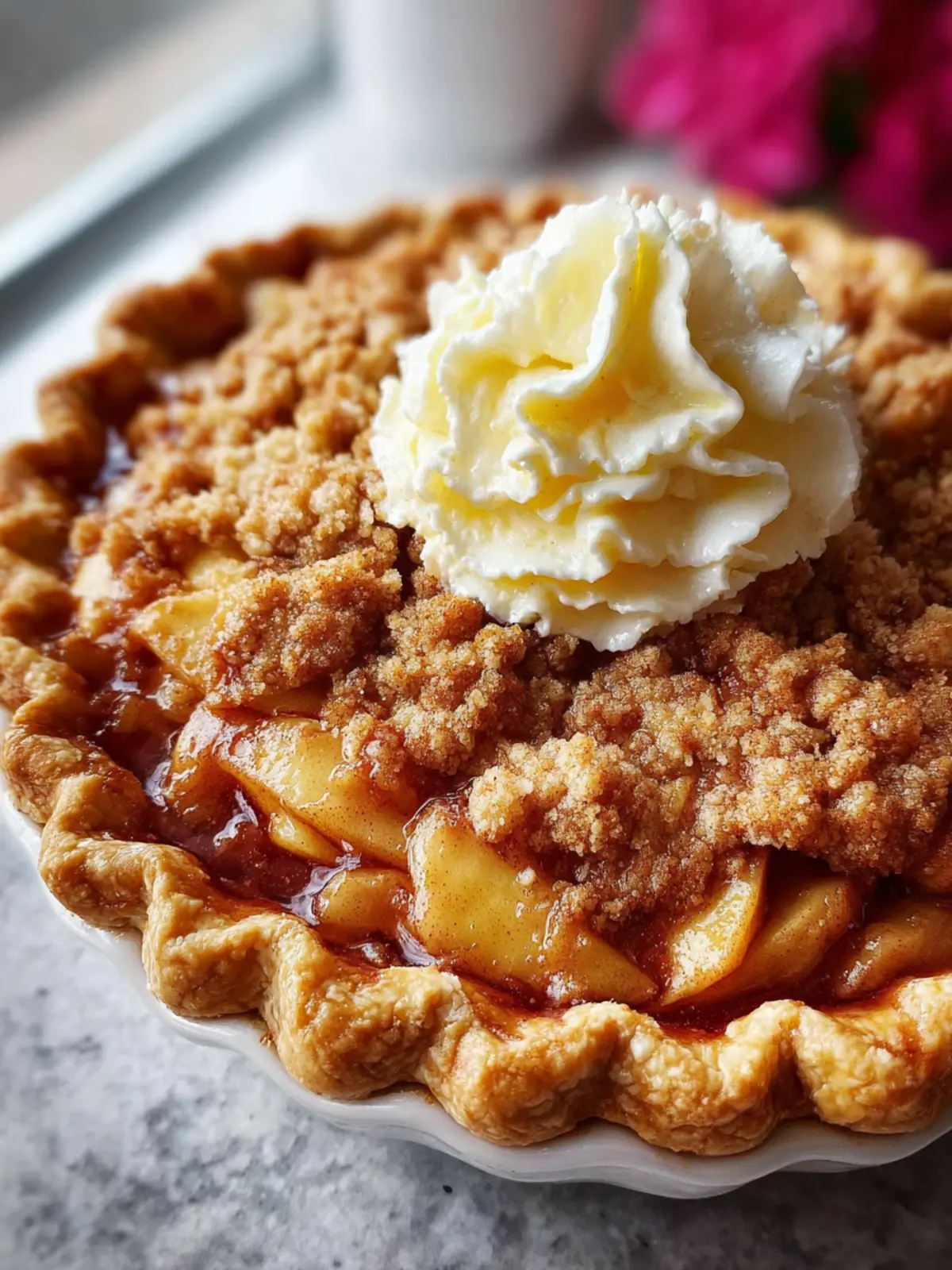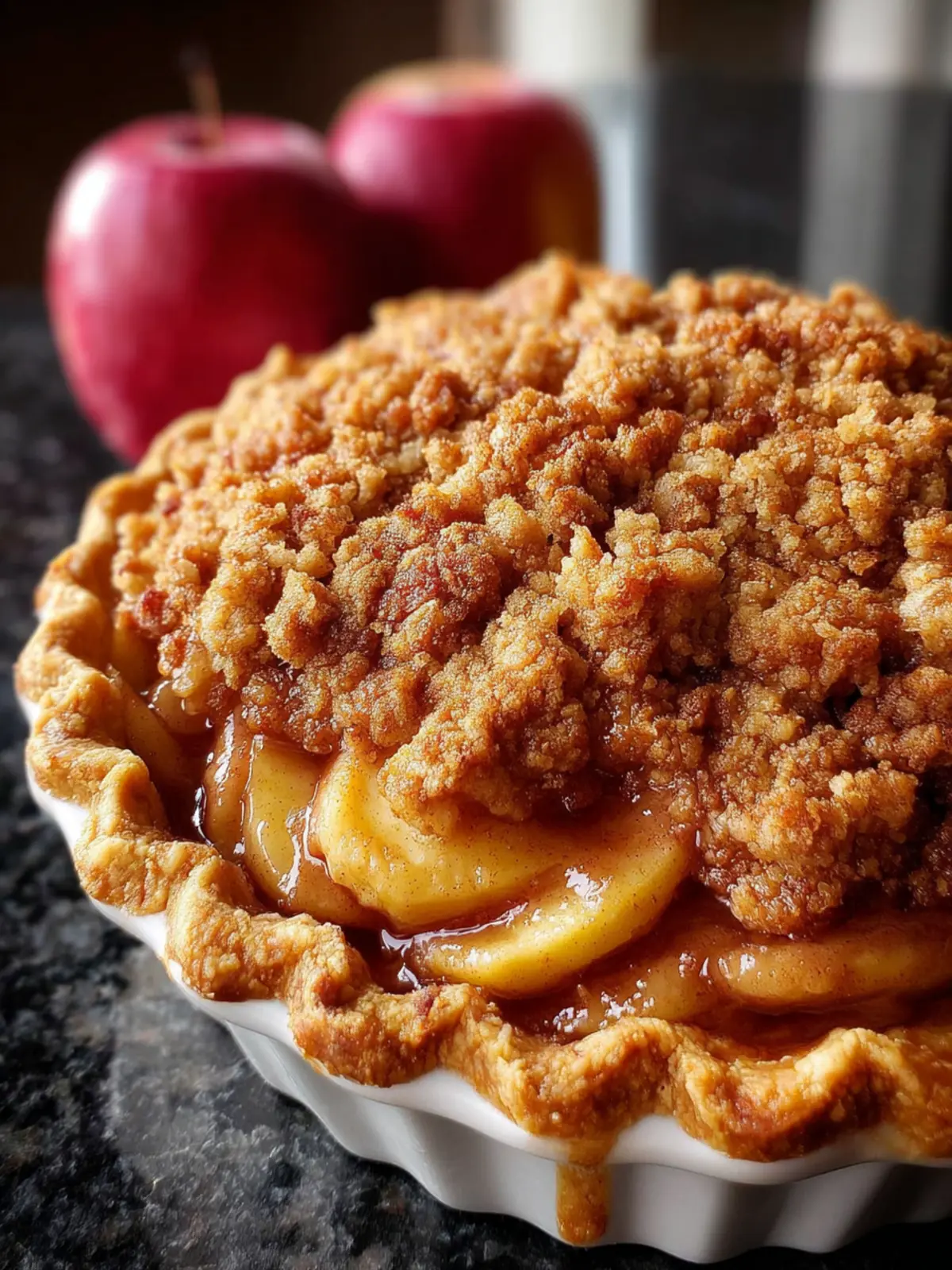 A delicious gluten-free apple pie made with sliced apples and a sweet streusel topping.